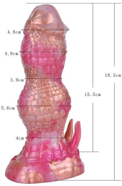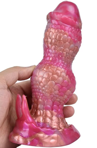 Dildon har en skimrande rosa och kopparfärg med en texturerad yta som liknar fjäll. Bred bas för säker användning.