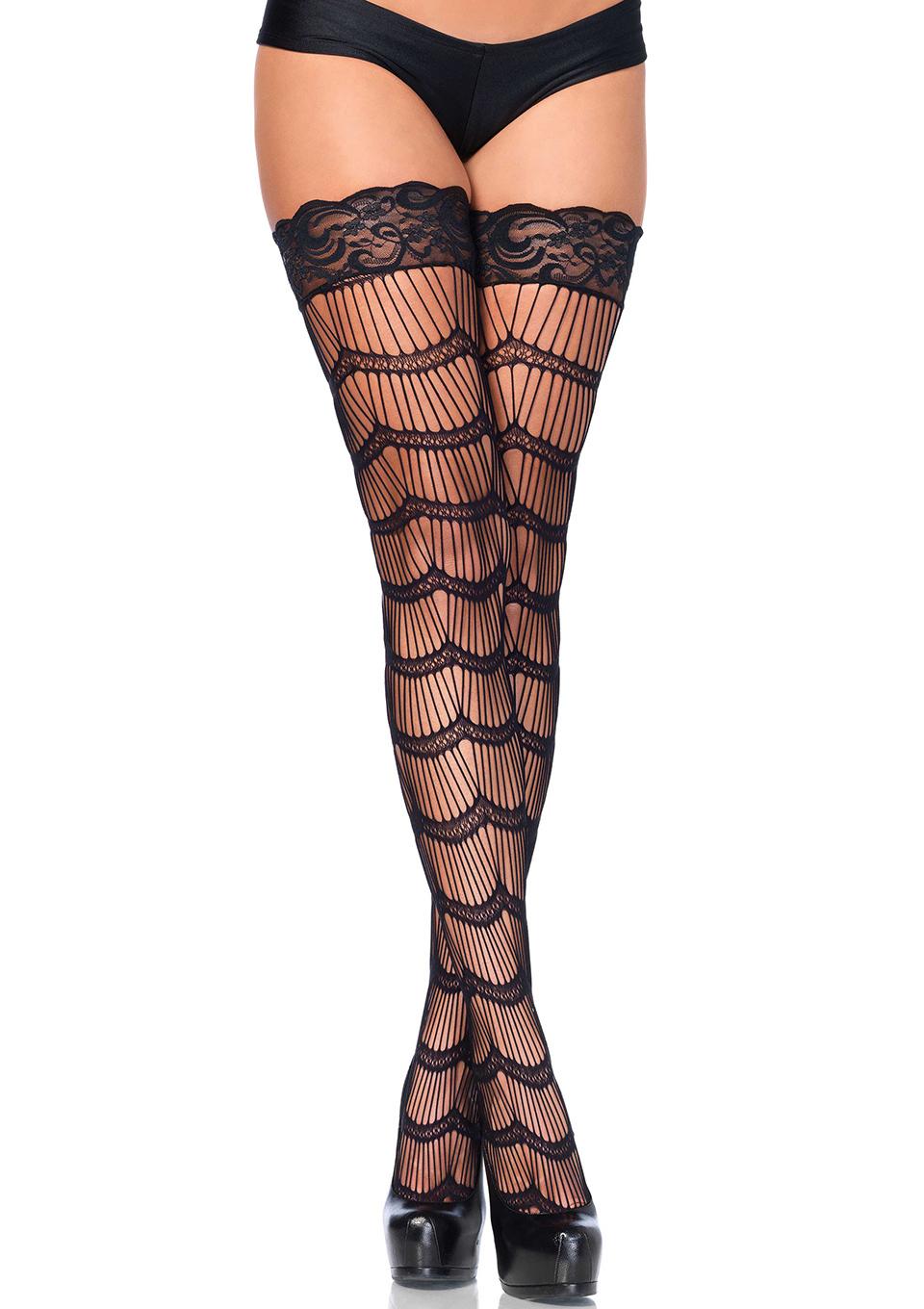 Stay up lace top scalloped eyelash thigh highs with silicone top.