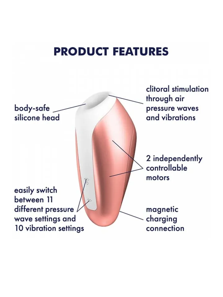 På grund av sin lätthanterliga form är Satisfyer Love Breeze en idealisk tryckvågsvibrator för resor: Med en sensuell kombination av tryckvågor och sprudlande undertryck stimuleras klitoris utan beröring med 11 olika intensiteter, vilka bekvämt kan styras via den intuitiva styrenheten. Med sin kompakta form kan den enkelt förvaras i handväskan och är genom sitt återuppladdningsbara batteri alltid redo när du längtar efter sensuell klitorisstimulering.